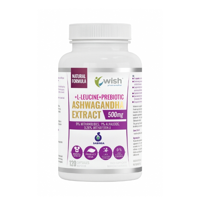Ingredients: Ashwagandha extract 8:1 (Withania Somnifera), FOS (Actilinght®), vegetable capsule, L-leucine (amino acid).